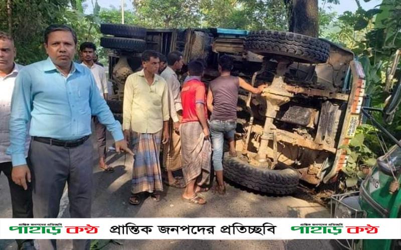লামায় ইটবাহী ট্রাক উল্টে ড্রাইভার হেলপার আহত
