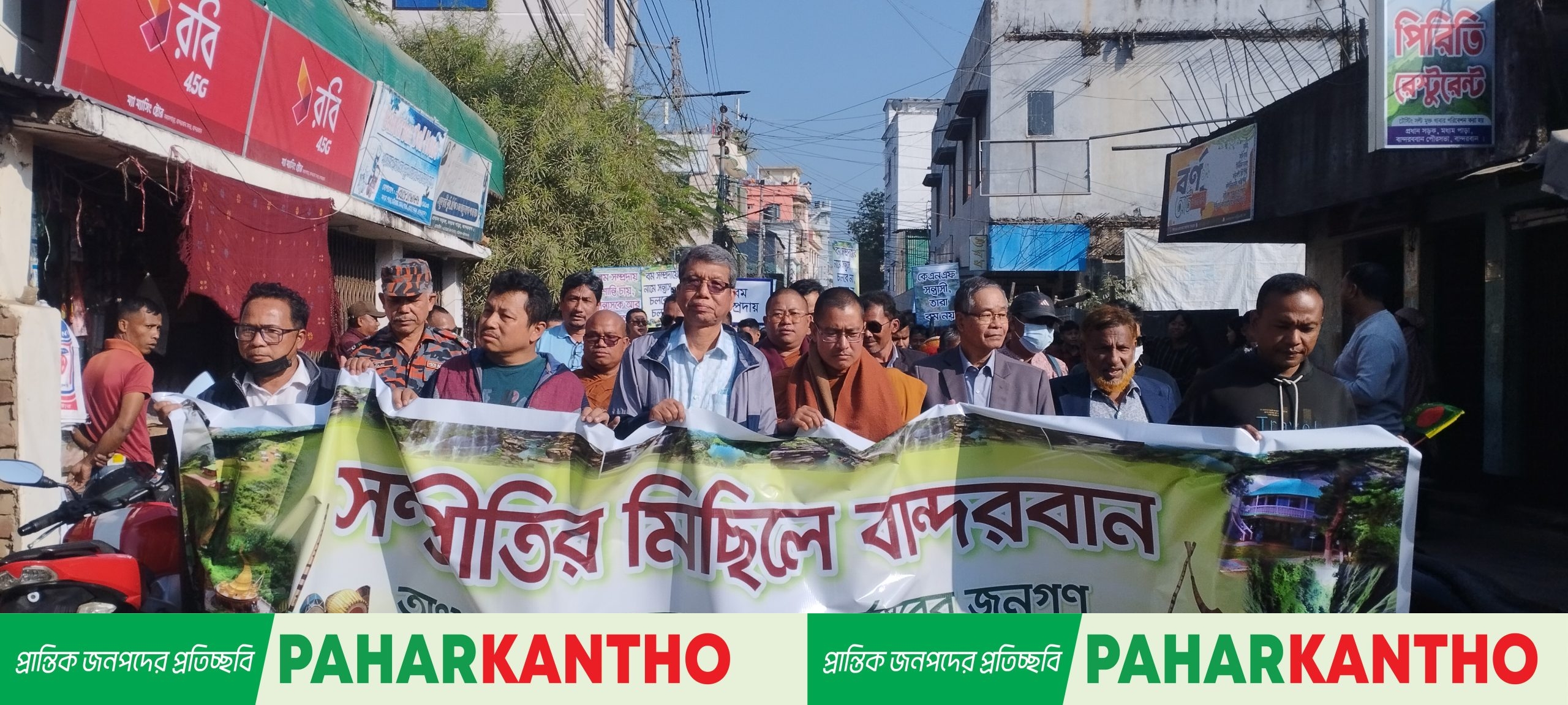 বান্দরবানে পাহাড়ে শান্তি রক্ষার উদ্দেশ্যে সম্প্রীতির মিছিলের আয়জন।