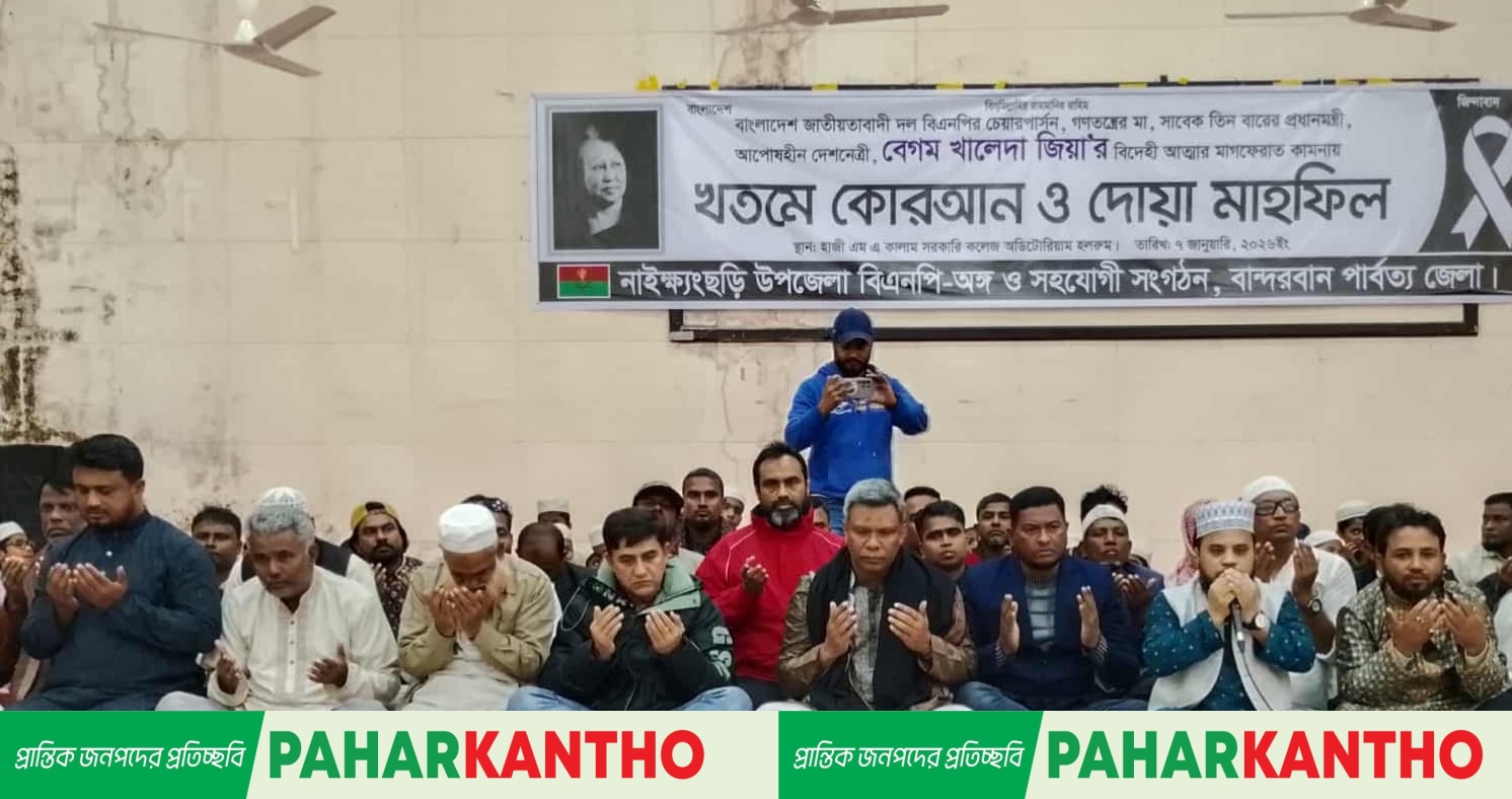নাইক্ষ্যংছড়ি প্রতিনিধিঃ বান্দরবানের নাইক্ষ্যংছড়িতে বিএনপর চেয়ারপারসন মরহুম বেগম খালেদা জিয়ার রুহের মাগফেরাত কামনায় কোরান খতম ও দোয়া মাহফিল অনুষ্ঠিত হয়েছে।