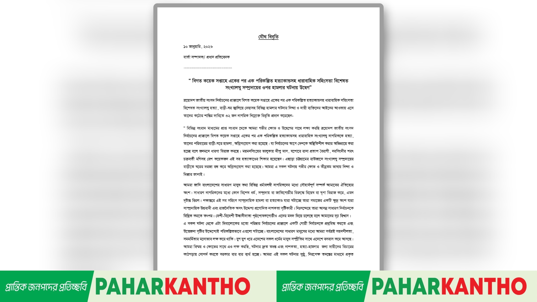 বিবৃতিতে উল্লেখ করা হয়, বিভিন্ন সংবাদমাধ্যমে প্রকাশিত তথ্যমতে ময়মনসিংহের ভালুকায় দীপু দাস, যশোরে রানা প্রতাপ বৈরাগী, নরসিংদীর শরৎ চক্রবর্তী মণিসহ একাধিক সংখ্যালঘু নাগরিক হত্যাকাণ্ডের শিকার হয়েছেন। এছাড়া চট্টগ্রামের রাউজানে সংখ্যালঘু সম্প্রদায়ের বাড়িতে দরজা বন্ধ করে অগ্নিসংযোগের ঘটনাও ঘটেছে। এসব ঘটনায় গভীর ক্ষোভ ও তীব্র নিন্দা জানানো হয়।