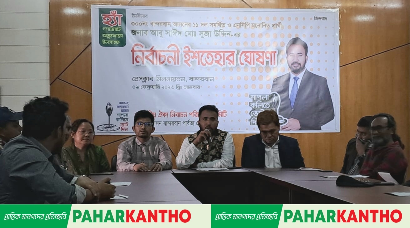 শান্তি,সাম্প্রদায়িক সম্প্রীতি ও গণমুখী উন্নয়নের ভিত্তিতে সমৃদ্ধ বান্দরবান গড়ার অঙ্গীকার ব্যক্ত করেছেন বান্দরবান ৩০০নং সংসদীয় আসনে জাতীয় নাগরিক পার্টি (এনসিপি) ও ১১দলীয় জোটের প্রার্থী আবু সাইদ মোঃ সুজাউদ্দিন।