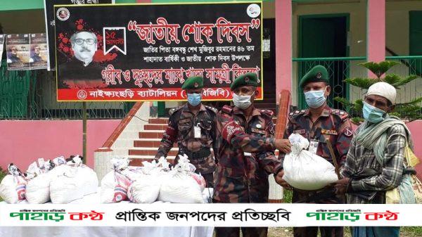 জাতীয় শোক দিবস উপলক্ষে বর্ডার গার্ড বাংলাদেশ (বিজিবি)১১ ব্যাটালিয়ান নাইক্ষ্যংছড়ি জোন কর্তৃকপক্ষে ১শত জনের গরীব ও দুঃস্থদের খাদ্য সামগ্রী মধ্যে প্রতিজনকে চাল, আটা, ডাল, লবণ, আলু ও তেল দেয়া হয়।