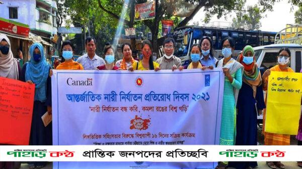 এসময় “ শিক্ষা ও দক্ষতার মাধ্যমে পার্বত্য চট্টগ্রামে মেয়ে শিশু ও নারীর ক্ষমতায়ন প্রকল্পের ”আওতায় লিঙ্গ ভিত্তিক সহিংসতার বিরুদ্ধে ১৬দিন ব্যাপী সক্রিয় কার্যক্রম (২৫শে নভেম্বর ১০ই ডিসেম্বর ২০২১) উপলক্ষে ব্যানার ও প্ল্যাকার্ড হাতে নিয়ে বিভিন্ন নারী ও পুরষ অংশ নেয়।