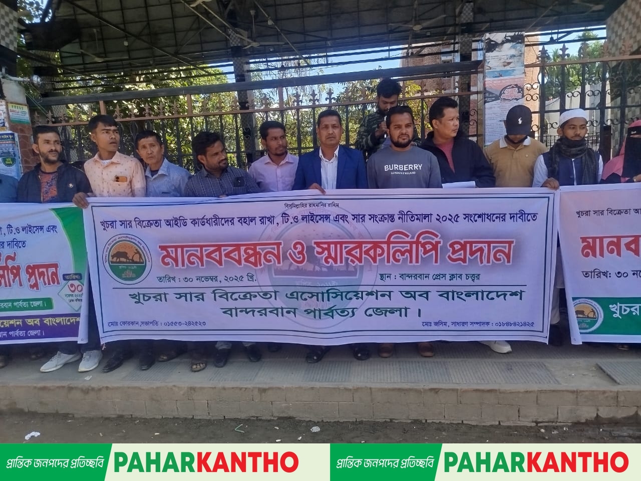 বান্দরবান প্রতিনিধিঃ খুচরা সার বিক্রেতা আইডি কার্ডধারীদের বহাল রাখা, টি.ও লাইসেন্স এবং সার সংক্রন্ত নীতিমালা ২০২৫ সংশোধন দাবিতে মানববন্ধন করে খুচরা সার বিক্রেতা এসোসিয়েশন অব বাংলাদেশ বান্দরবান জেলা শাখা। রবিবার…
