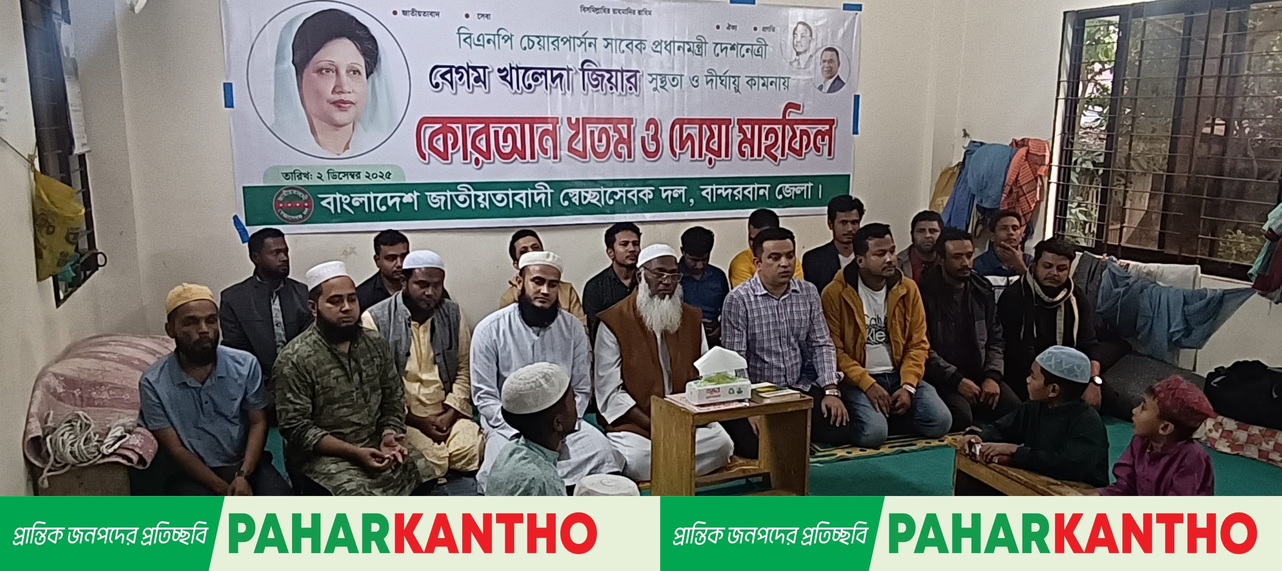 বাংলাদেশ জাতীয়তাবাদী দল (বিএনপি) চেয়ারপারসন ও সাবেক প্রধানমন্ত্রী বেগম খালেদা জিয়ার দ্রুত রোগমুক্তি ও দীর্ঘায়ু কামনায় বাংলদেশ জাতিয়তাবাদী সেচ্ছাসেবক দল বান্দরবান জেলা শাখার উদ্যোগে কোরআন খতম ও দোয়া মাহাফিল আয়োজন…