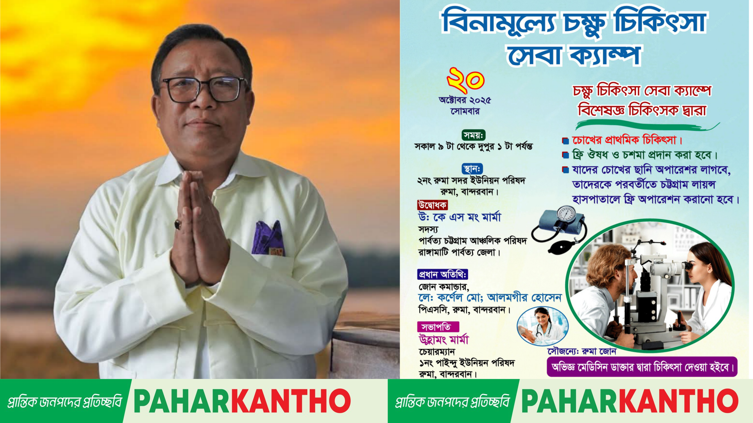 বান্দরবানের রুমা উপজেলায় আগামী ২০ অক্টোবর (সোমবার) অনুষ্ঠিত হতে যাচ্ছে বিনামূল্যে চক্ষু চিকিৎসা ক্যাম্প। পার্বত্য চট্টগ্রাম আঞ্চলিক পরিষদের সদস্য উ: কে এস মং-এর উদ্যোগে এবং চট্টগ্রাম লায়ন্স দাতব্য চক্ষু হাসপাতালের…