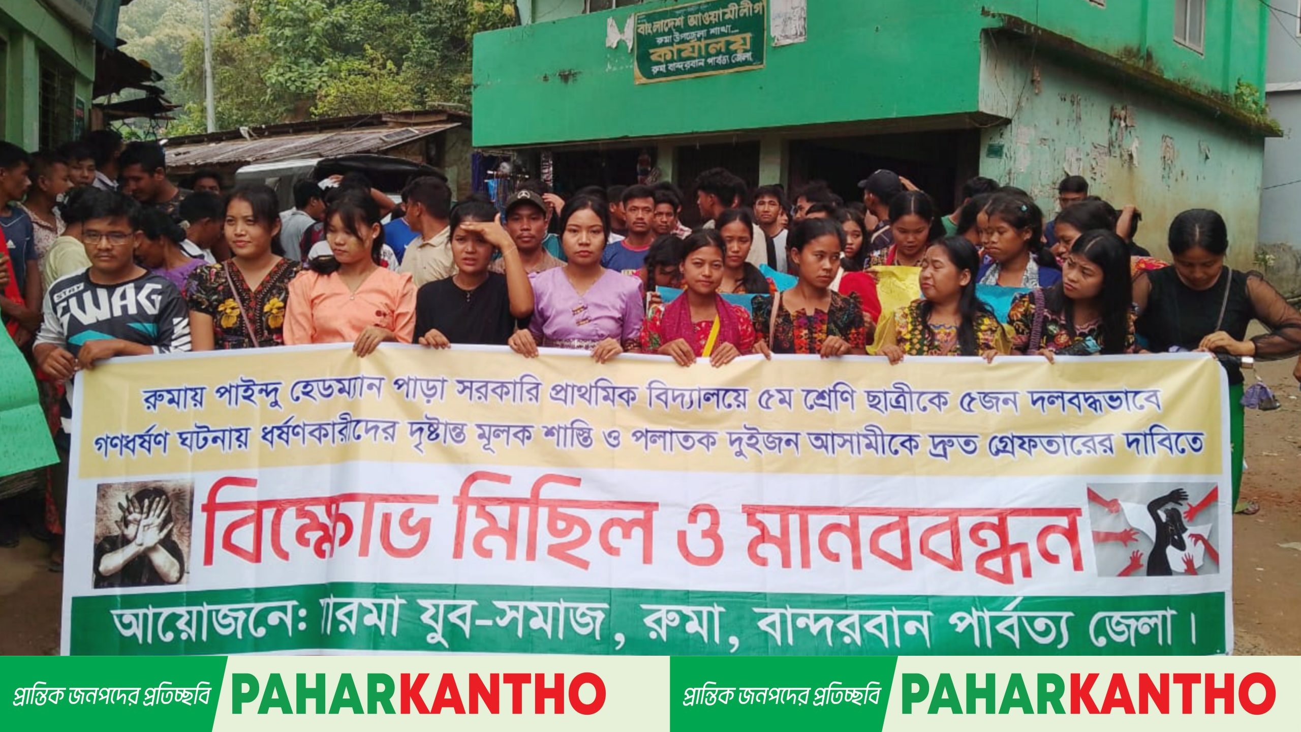 রুমায় শিশু ধর্ষণের ঘটনায় মানববন্ধন ও বিক্ষোভ মিছিল: বিচারের দাবিতে উত্তাল মারমা জনগোষ্ঠী